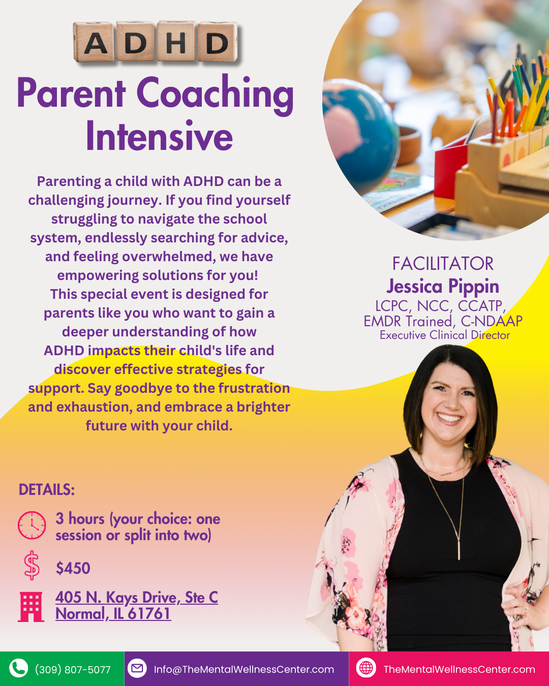 This will be a three hour intensive which is designed for parents who are interested in learning more about the ways that their child’s ADHD is impacting their lives and get strategies for how to help them.